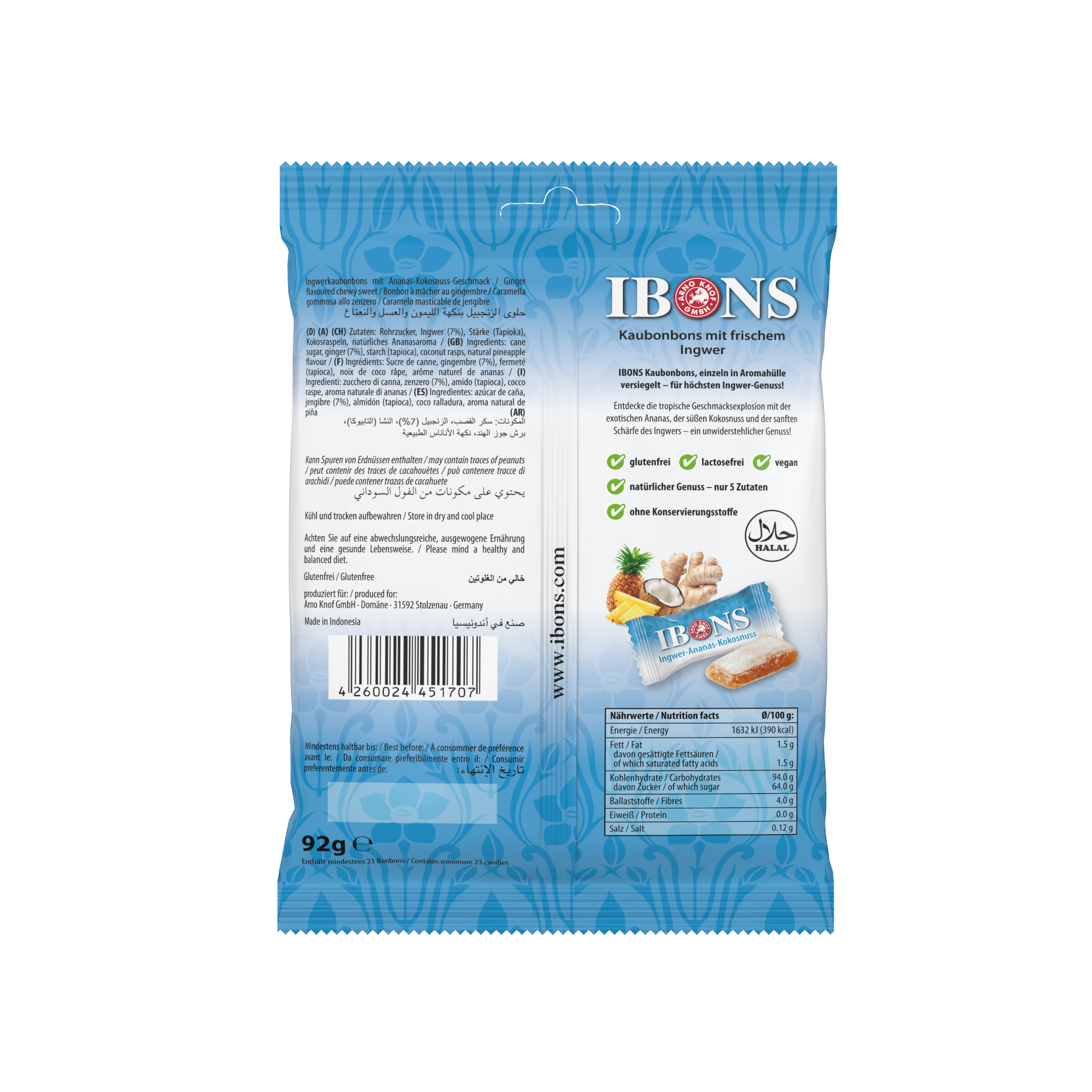 Unser exotisches Kaubonbon IBONS Ingwer-Ananas mit Kokosnuss ist zart, weich und angenehm mild. Das harmonische Geschmackserlebnis entsteht aus der fruchtigen Süße sonnengereifter Ananas, der feinen Cremigkeit von Kokosnuss und der sanften, belebenden Schärfe von Ingwer. Die ausgewogene Kombination sorgt für ein wunderbar weiches Mundgefühl und eine milde Ingwernote, die nicht dominiert, sondern perfekt ergänzt. Ideal für alle, die Ingwer lieben und eine sanftere, exotische Variante genießen möchten. Das Besondere an unseren IBONS Kaubonbons ist unser kompromissloser Anspruch an Qualität: Wir verwenden ausschließlich ausgewählte Zutaten.