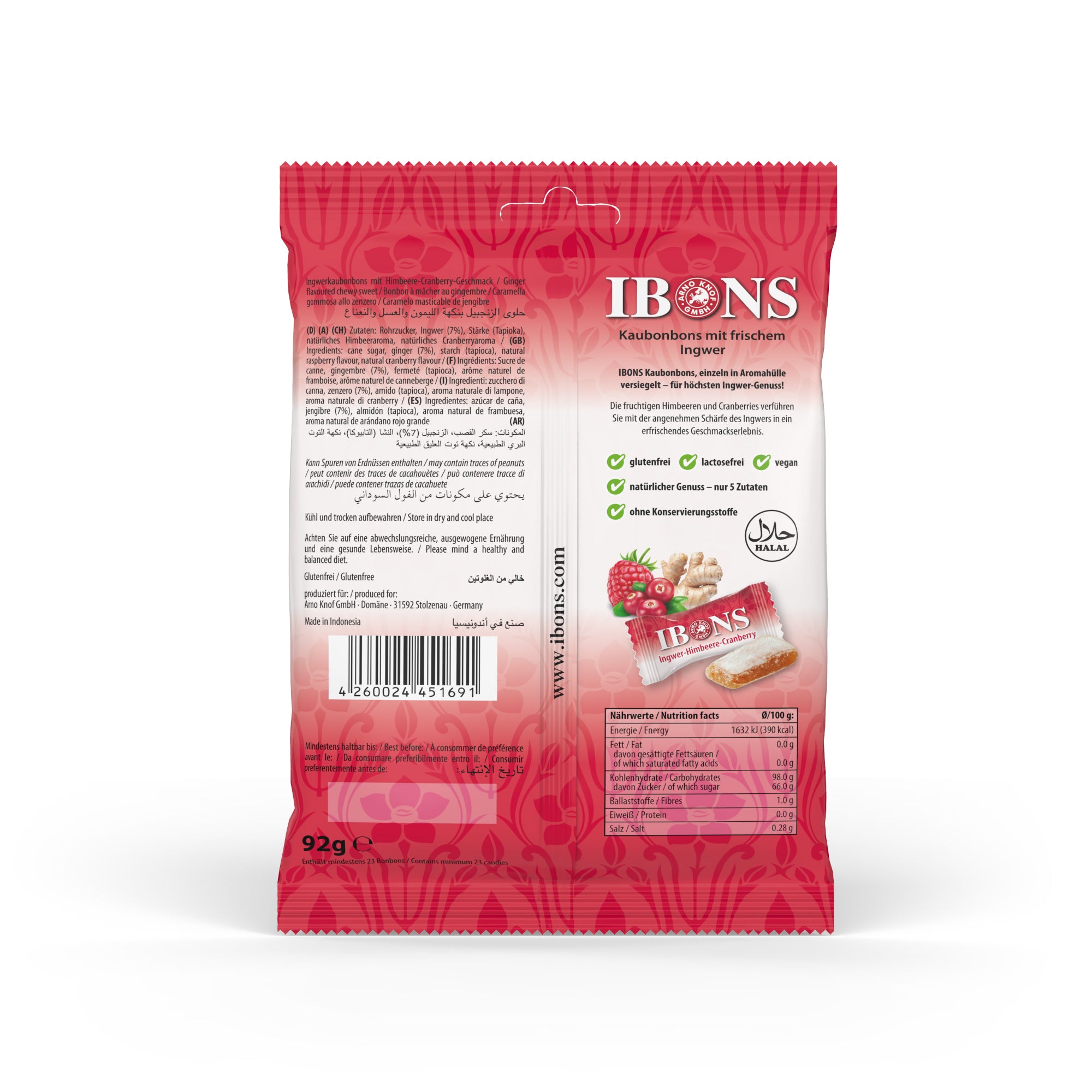 Fruchtig, ausgewogen und unverwechselbar: IBONS Ingwer-Himbeere mit Cranberry vereint die Süße reifer Himbeeren mit der feinen Säure von Cranberries und der wärmenden Schärfe von Ingwer.Für unsere IBONS verwenden wir echten Ingwer und ausgewählte Zutaten, dieschonend verarbeitet werden, um Geschmack und Nährstoffe zu bewahren. Das machtjedes IBONS Ingwer-Himbeere mit Cranberry Kaubonbon zu einem besonderenGenussmoment.