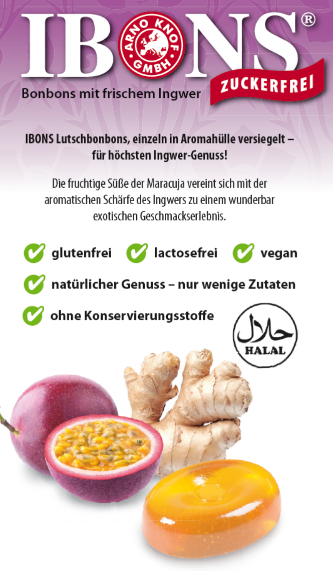 Unser IBONS Ingwer-Maracuja ist der exotische Höhepunkt unserer fruchtigen Lutschbonbons. Die vollmundig weiche Süße der Maracuja harmoniert ganz wunderbar mit der hintergründigen Schärfe des Ingwers und macht jedes Bonbon zu einem tropischen Genuss, von dem man gar nicht mehr die Finger lassen kann. Und die Frische des Ingwers unserer IBONS garantiert den vollen Geschmack - bei uns kommt nur das Beste in die Bonbons! Und man vermisst den Zucker gar nicht, so angenehm süß und leicht sind unsere IBONS Ingwer-Maracuja - einfach lecker ohne Zucker!